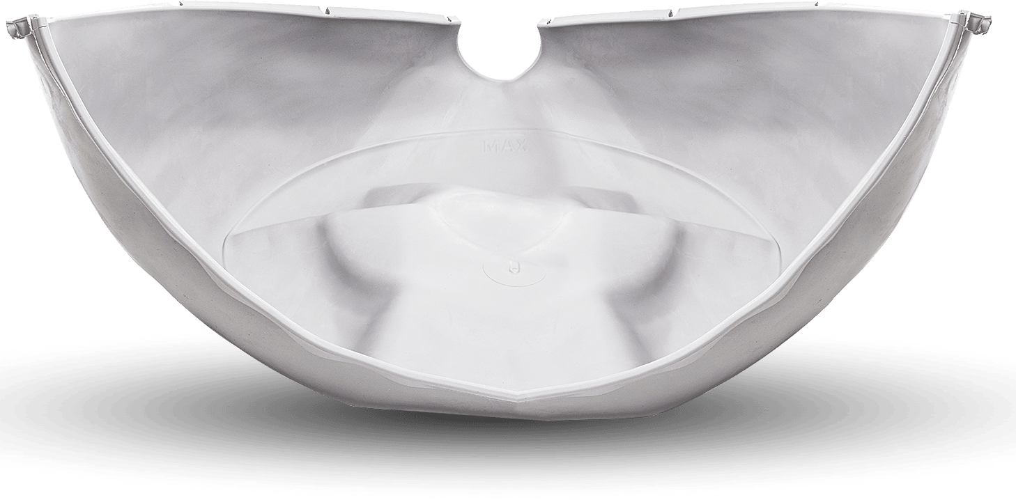 글로브 상단 반구를 아래 반구 위에 맞춰 내리세요. 두 반구는 라이너의 겹쳐진 가장자리를 실링으로 삼아 맞물리게 됩니다.